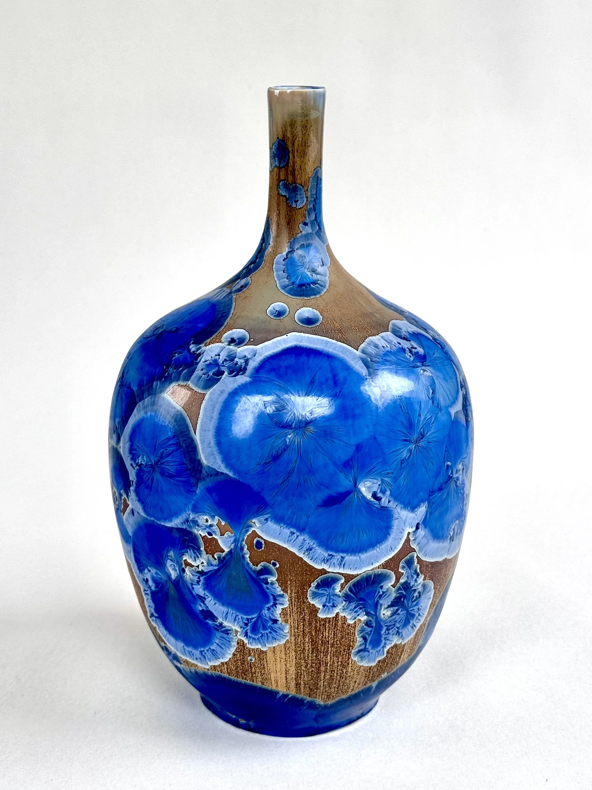 Graduating with a Ba Hons in Design from Staffordshire University in the heart of the British potteries in Stoke-on-Trent and specialising in glass and ceramics at the age of 21, I then went on to have a career as a glassblower and teacher of glass for many years before returning to my first love of pottery. My work for some years now has been wheel thrown porcelain which I glaze with crystalline glazes, these glazes contain the raw ingredients to create crystals that develop and grow in the kiln firing. Crystalline glazes on ceramic for me are the perfect marriage of the glassy crystalline magma that attracted me to molten glass and the earthy tactile clay.